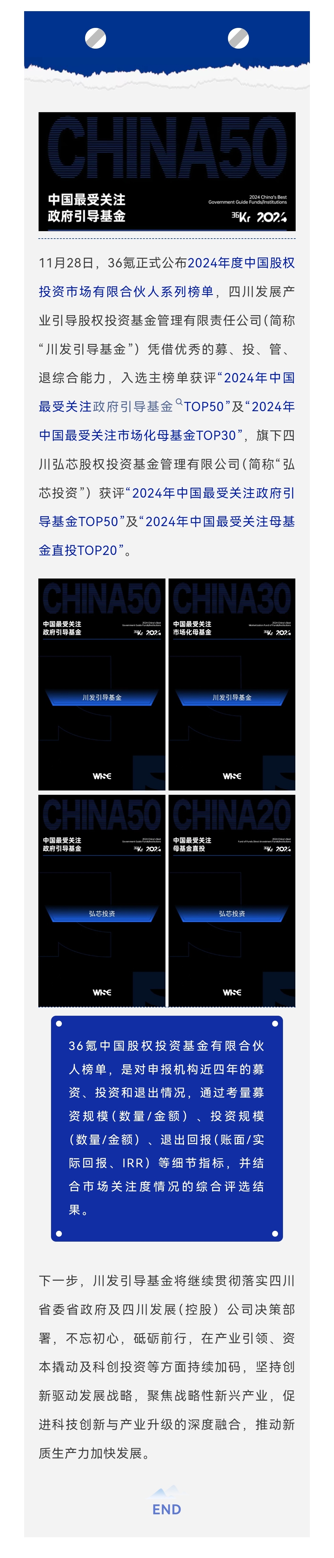 榮譽 | 川發引導基金及旗下弘芯公司入選36氪2024年中國股權投資基金有限合伙人榜單