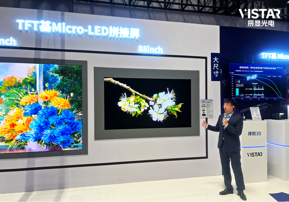 同日,辰顯光電還重磅發(fā)布了新一代88英寸P0.5TFT基Micro-LED拼接屏。該款產(chǎn)品支持10bit色深,可呈現(xiàn)高達(dá)10.7億種絢麗色彩,比傳統(tǒng)8bit屏幕提升256倍,色彩表現(xiàn)更鮮活、更逼真。搭載辰顯光電自主研發(fā)的Micro-LED專用驅(qū)動(dòng)IC,畫面流暢護(hù)眼,視覺更舒適。屏幕采用國(guó)際領(lǐng)先的25微米Micro-LED芯片,并通過(guò)頂尖的巨量轉(zhuǎn)移工藝,精確地將3300萬(wàn)顆LED完美拼接,實(shí)現(xiàn)了高達(dá)99.995%的良率。再加上DCI-P3 99%廣色域、2000nits峰值亮度、26000:1超高對(duì)比度和3%超低反射率,配合全球領(lǐng)先的混Bin技術(shù)2.0,畫面均勻性和色彩一致性達(dá)到巔峰,帶來(lái)前所未有的生動(dòng)、流暢和沉浸式視覺享受,重新定義了視覺體驗(yàn)的極限,為高端商顯市場(chǎng)和多場(chǎng)景應(yīng)用提供了更優(yōu)質(zhì)的解決方案。