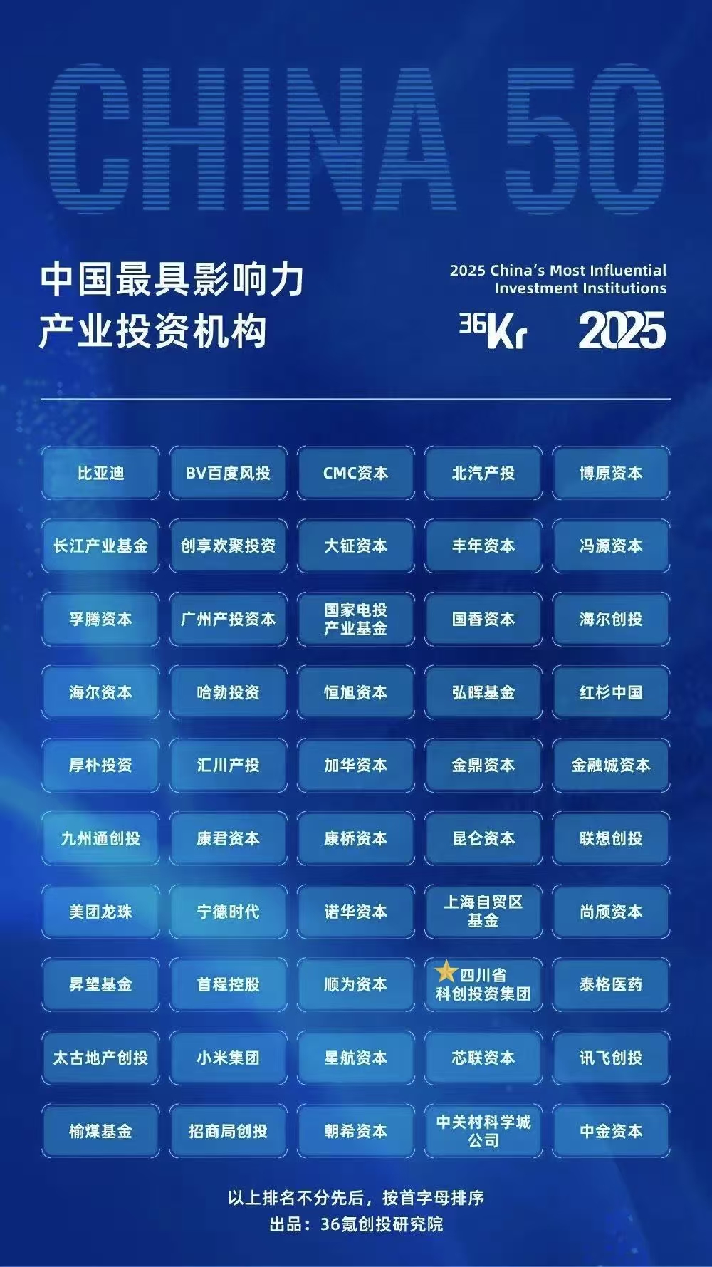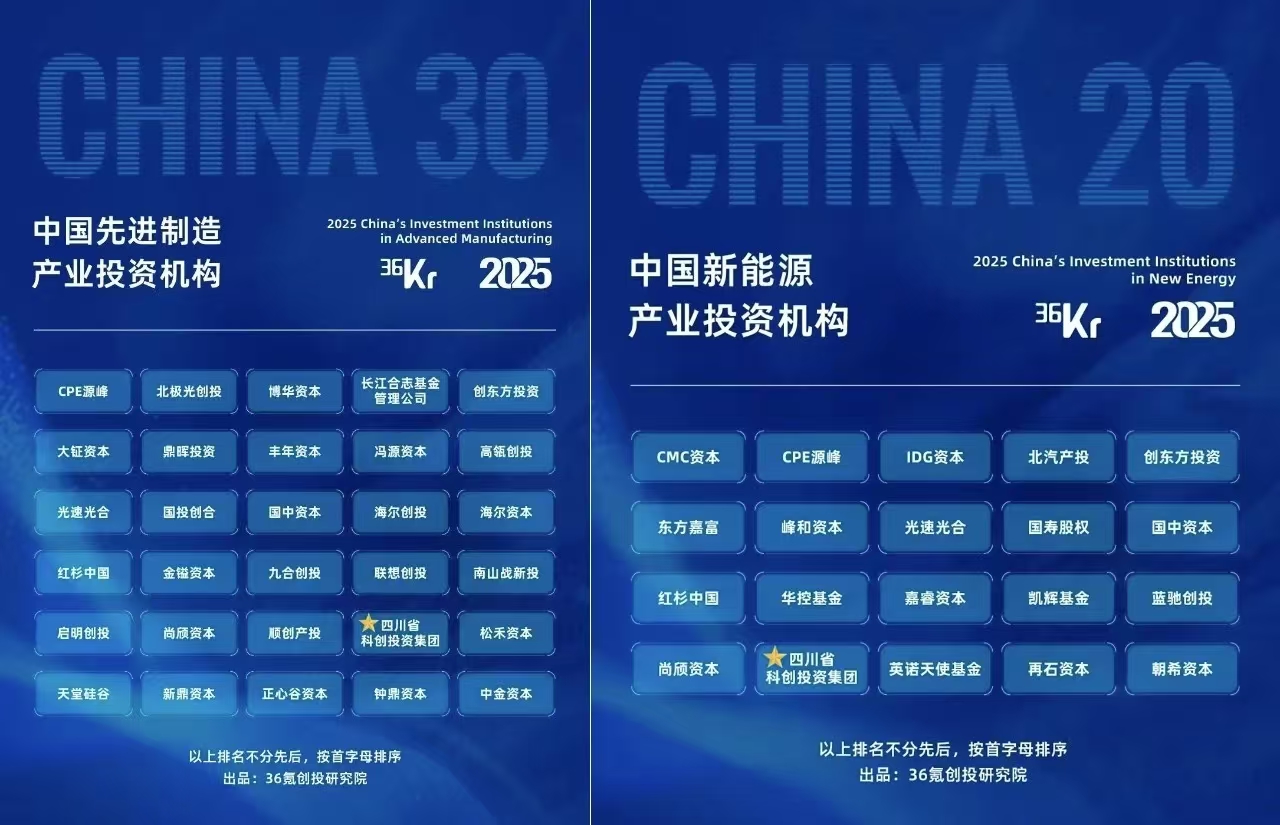 9月11日,36氪正式發布《2025年中國產業投資者年度名冊》,包括中國最具影響力產業投資機構、中國十大未來產業投資機構、中國十大未來產業投資人三大榜單。四川省科創投資集團憑借前瞻性的資本布局,入選“中國最具影響力產業投資機構TOP50”,并且在十大未來產業榜單中斬獲了“中國先進制造產業投資機構TOP30”“中國新能源產業投資機構TOP20”兩項殊榮。